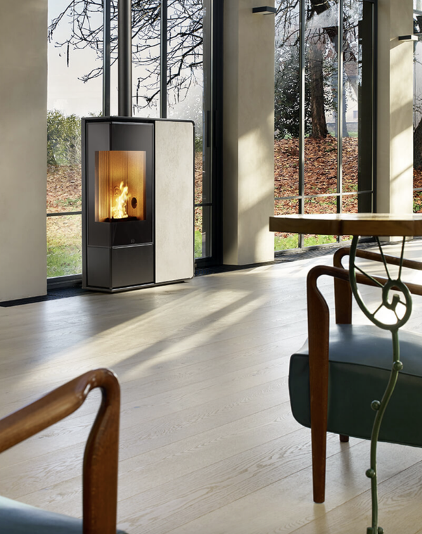 hij bijzonder geschikt om overal te geplaatst te worden. De moderne stijl, de afwezigheid van de traditionele zichtbare ventilatieroosters en het uitgezochte ontwerp worden vervolledigd door de elegantie van het hoekraam dat een breed zicht op de vlam biedt. De kachel wordt geleverd met “alle opties”: dit omvat standaard de verwijderbare luchtbevochtiger en het wifisysteem dat de kachel en de bediening op afstand beheert. U kunt kiezen voor het stalen profiel in de kleuren zwart, wit of tourterelle en het voorpaneel, altijd naar keuze, tussen grès ivoor, roestkleur, gezandstraalde speksteen, zwart gestreept glas, zwart staal.